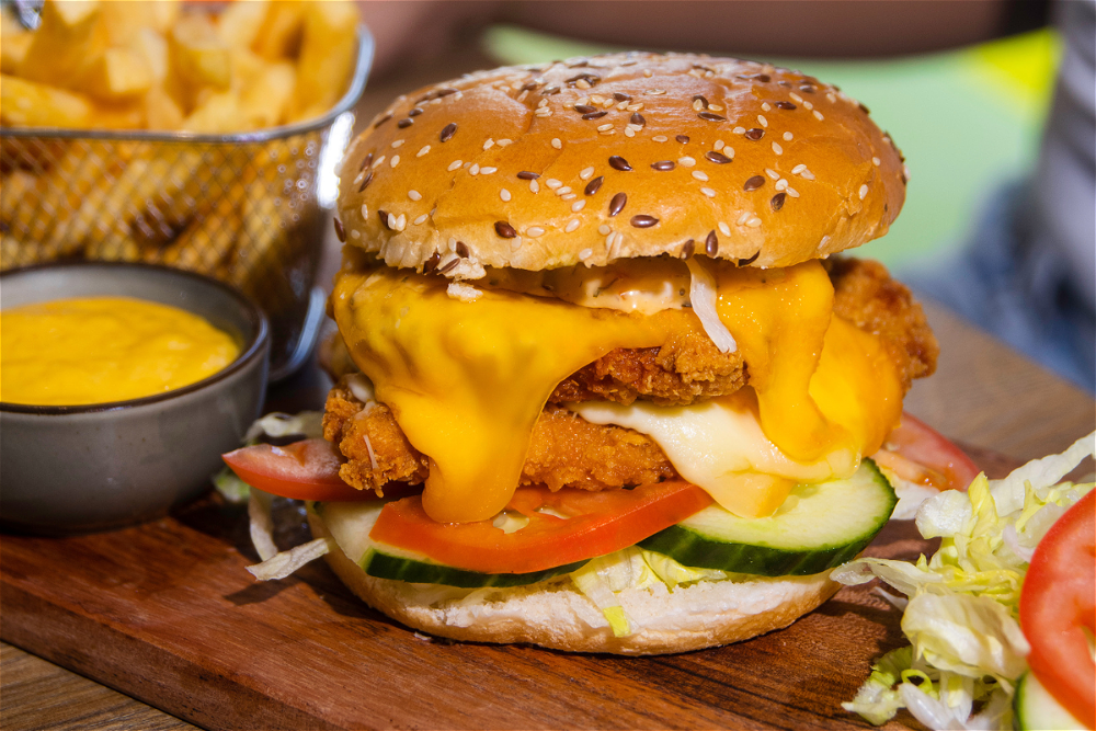 De pittige kipburger met sla, komkommer, tomaat, ui, kaas en Jamballa saus. Een perfecte pittige twist!